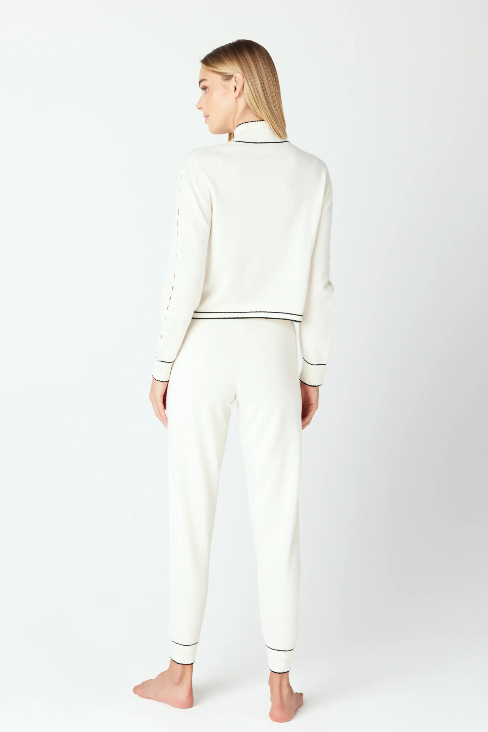 The Alice Jogger is constructed from the softest wool/cashmere blend. Drawer string with ribbed waist and cuff with contrasting black detail. Comfy cozy, but lush at the same time. They pair beautifully with the June half-zip sweater or Jacqueline pullover.