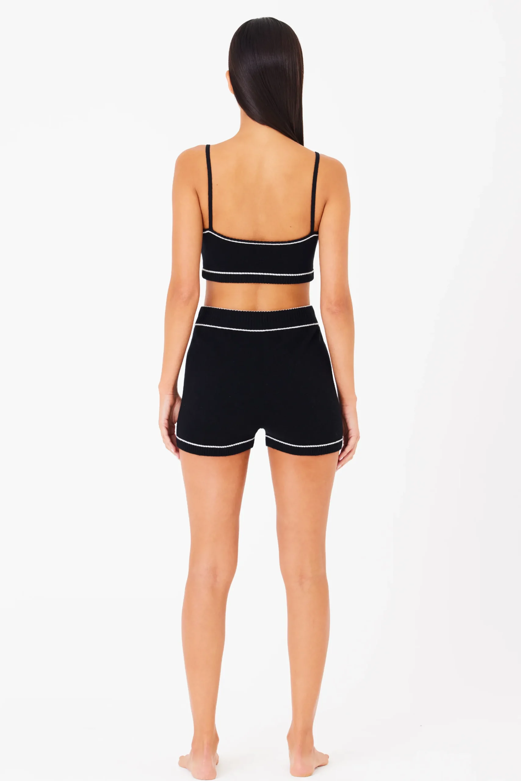 The newest addition to our cashmere loungewear is the Danica shorts. Danica is constructed from the softest wool/cashmere blend. Drawer string with ribbed waist and cuff with contrasting ivory detail. Comfy cozy, but lush at the same time. They pair beautifully with the Danica Bralette, June half-zip sweater, or Jacqueline pullover.