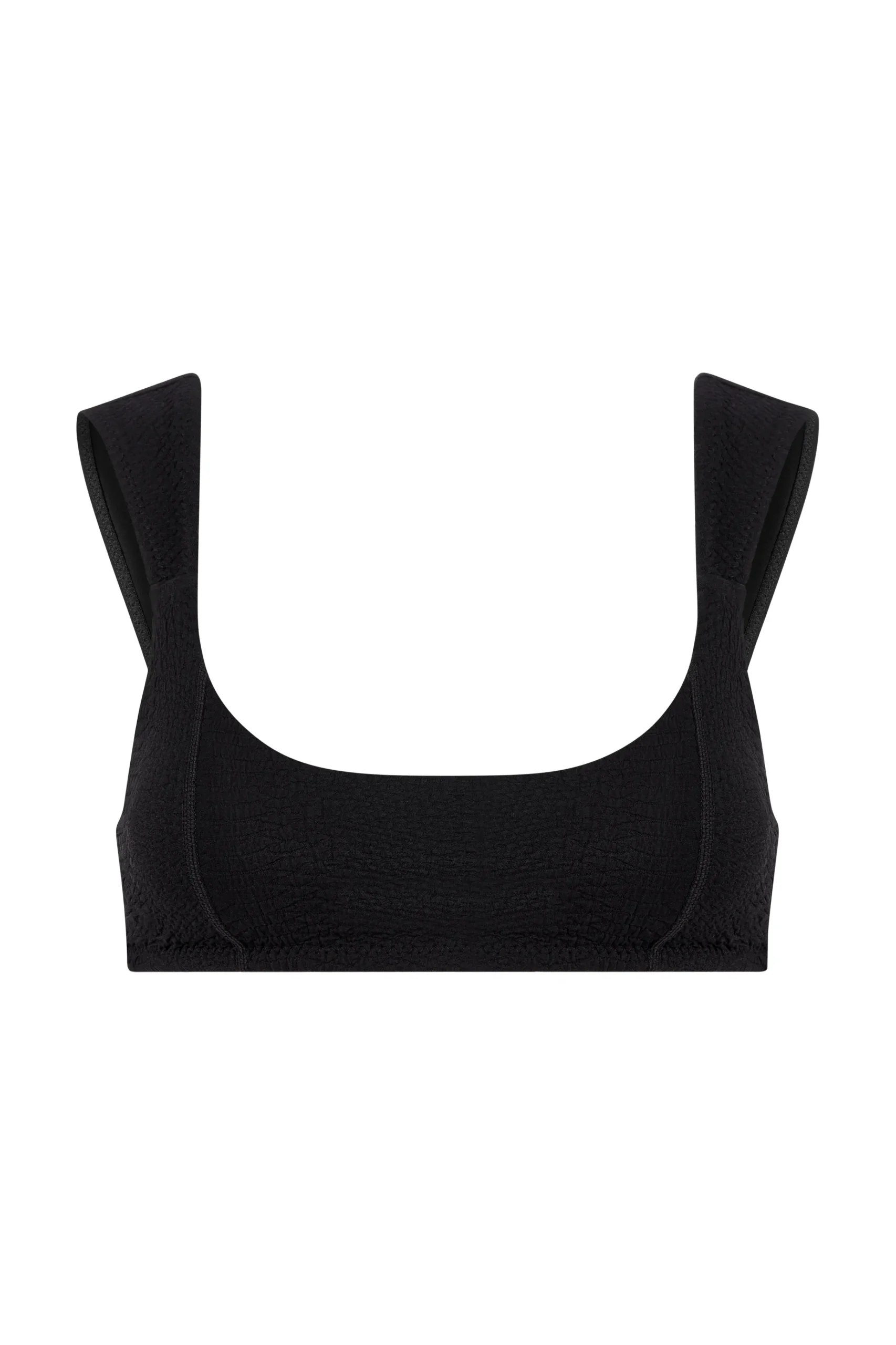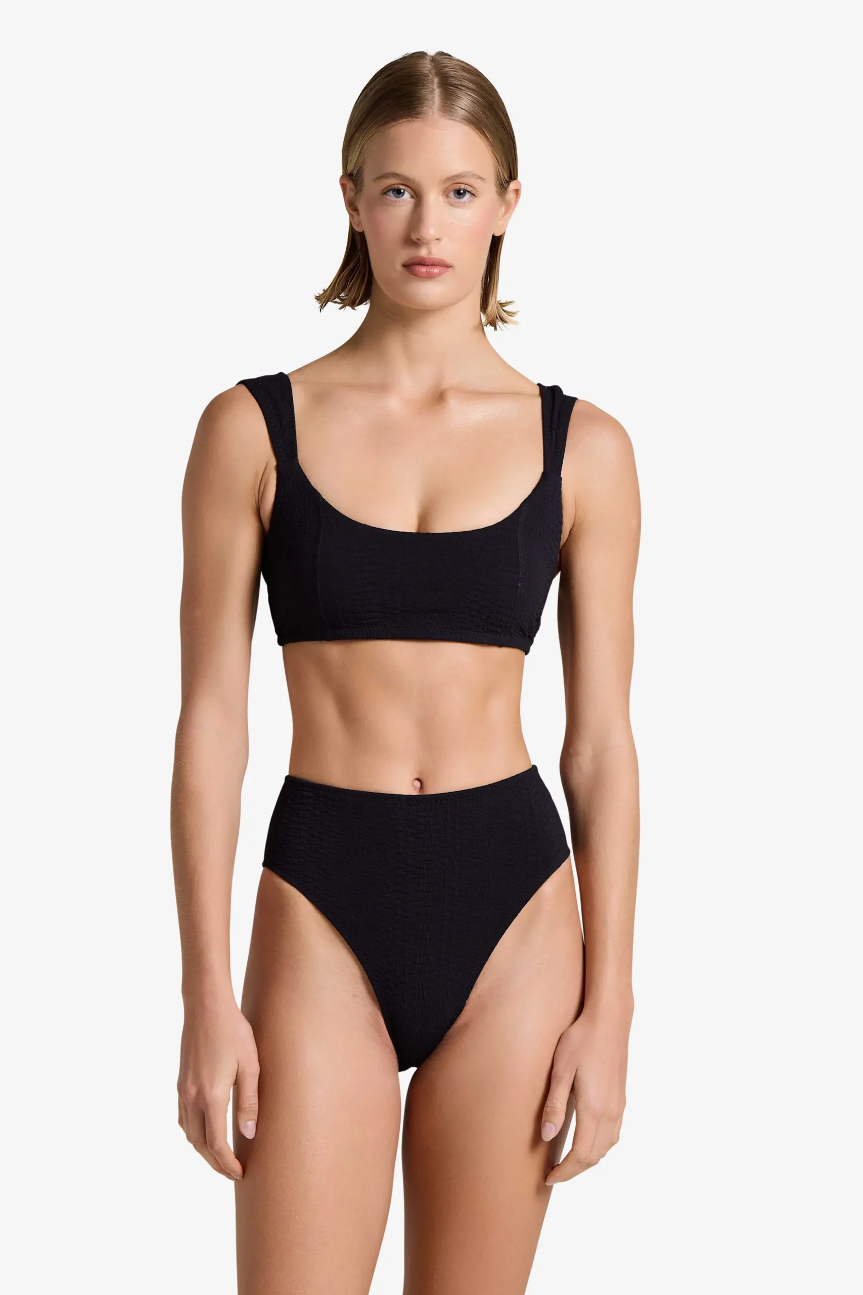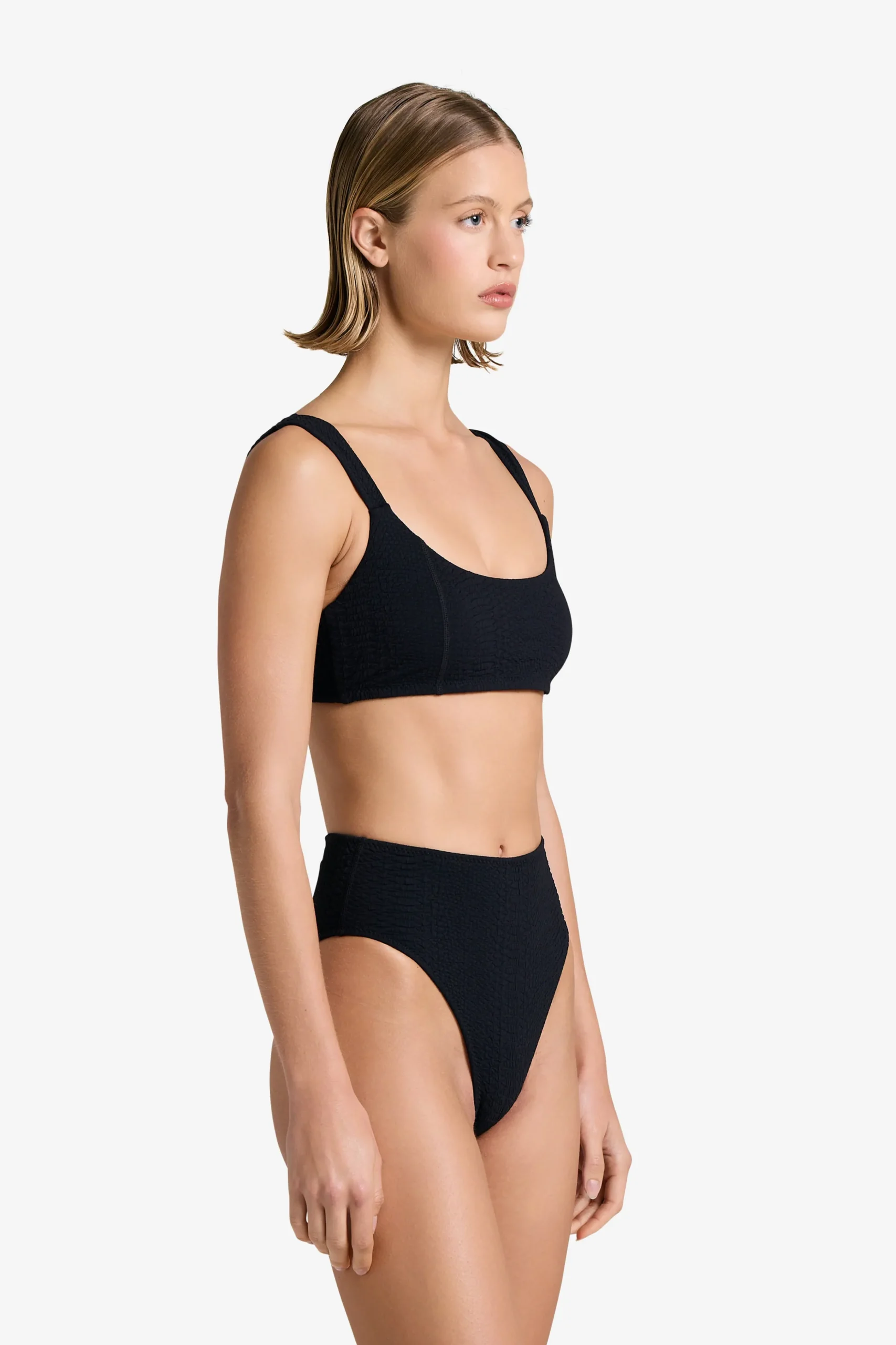 The Dawson Top is crafted from our custom snakeskin embossed fabric, offering up a stretch and return fabric to maintain its form after years of water wear. This top includes removable bust pads and is fully lined. Pair it with the Melinda Bottom for a minimal complete look, making this your go-to little black bikini.