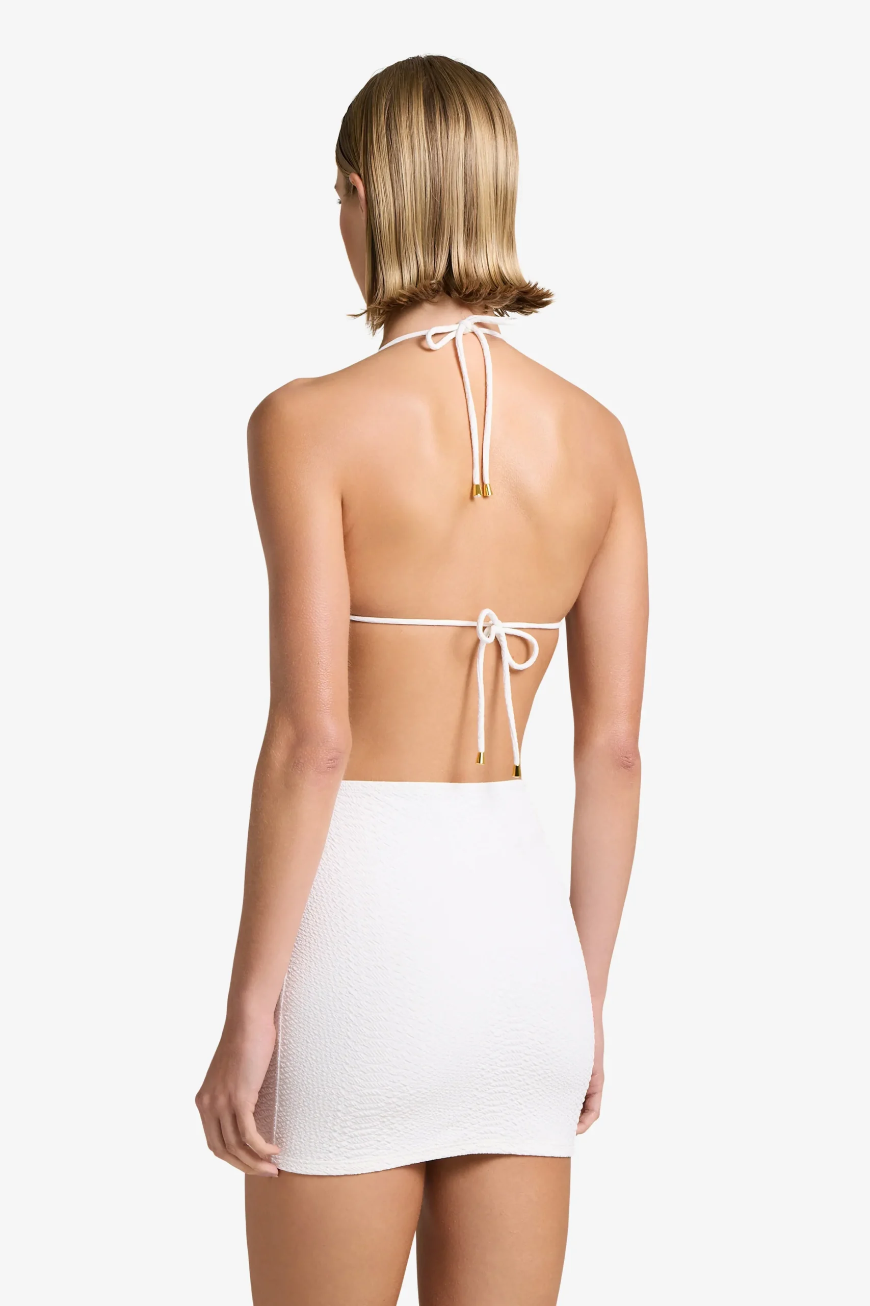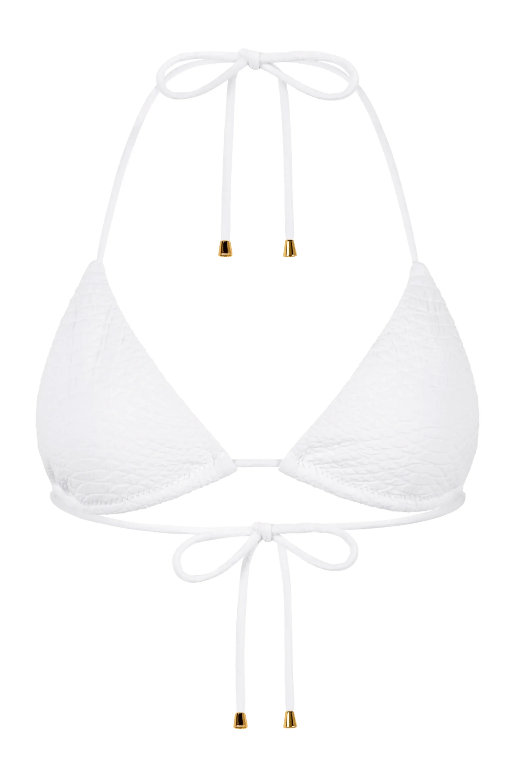 The Joni Top is crafted from our custom snakeskin embossed fabric, is fully lined and includes gold hardware on the end of each tie. Designed for flattering, minimal coverage, making it the perfect summer suit. Complete the look with the Joni Bottom and Joelle Skirt.