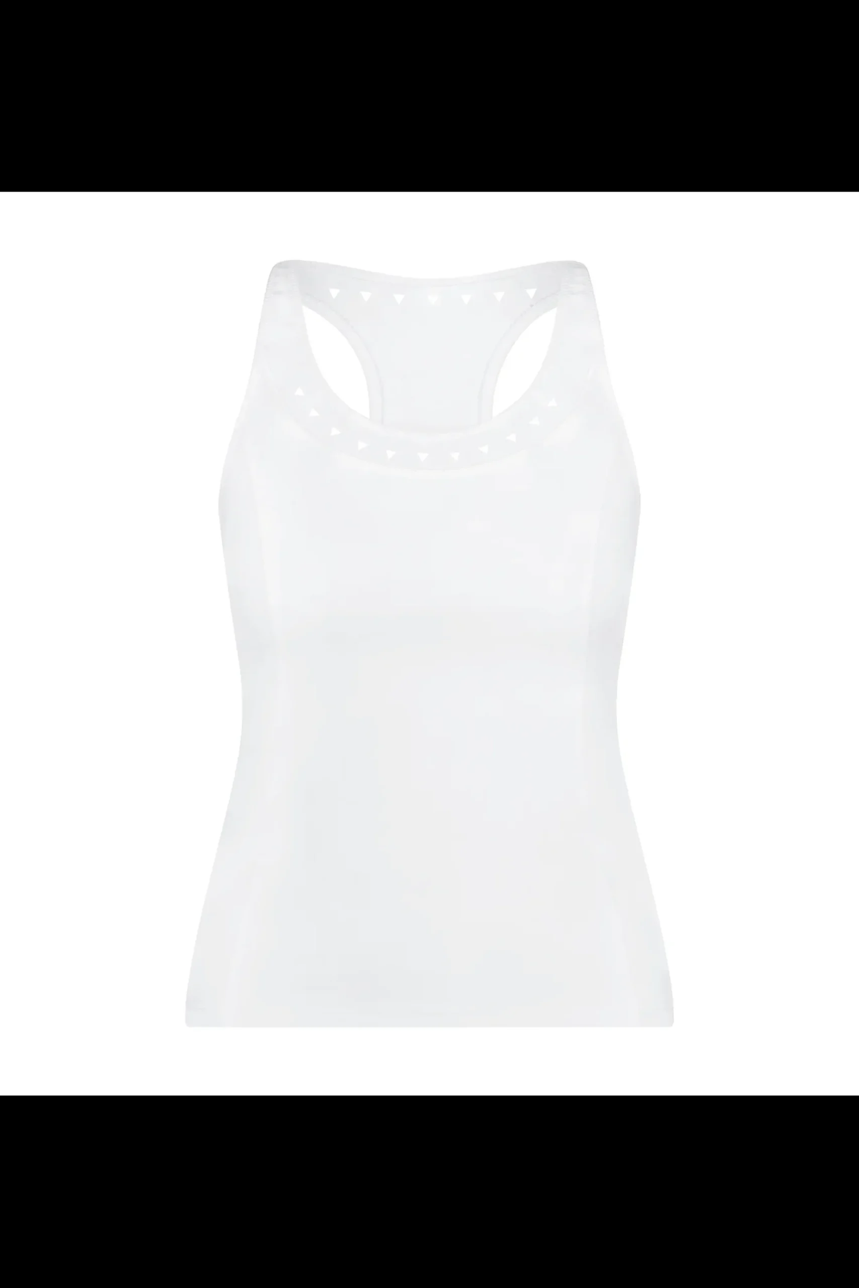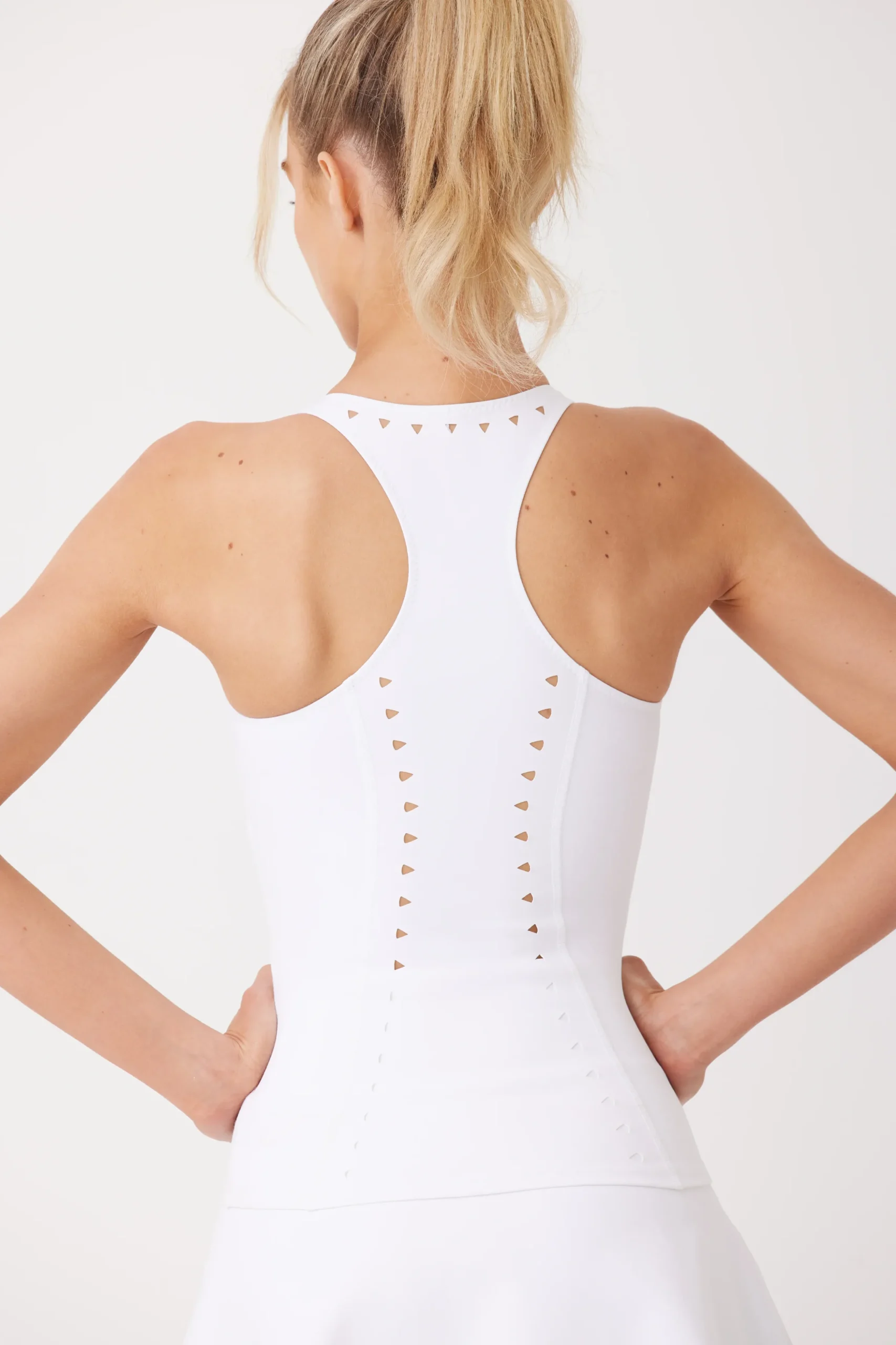 The Roberta Tank features our signature triangle laser cutouts in a super soft, breathable fabric. Shelf bra with removable pads, low scoop neck, and racer back. Pair with the Susie Skirt for a love match.
