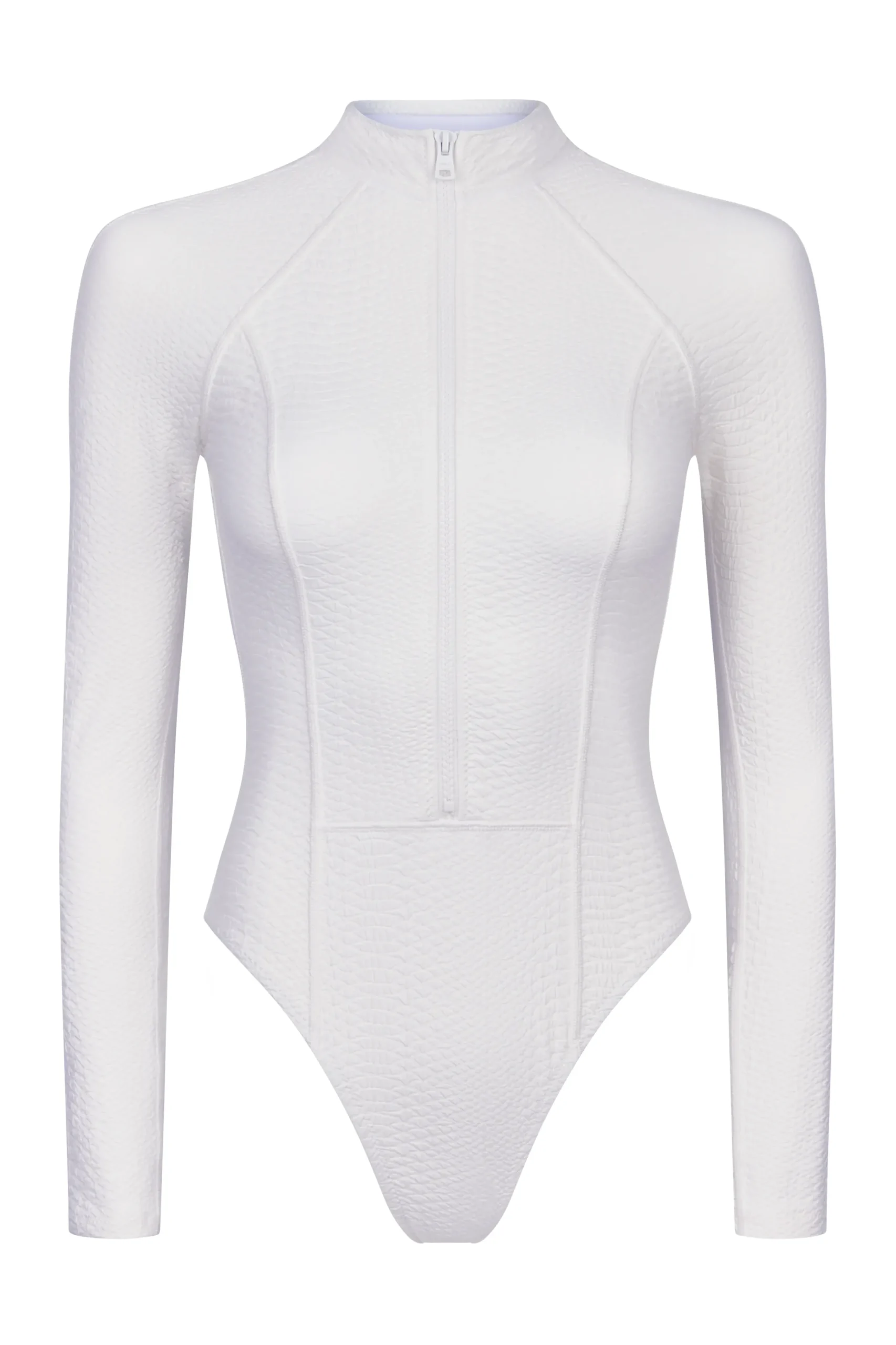 The Sophie Surfsuit is lined and crafted from our custom snakeskin embossed fabric. This piece offers a stretch and return fabric to maintain its form after years of water wear, making it functional for any water sport.