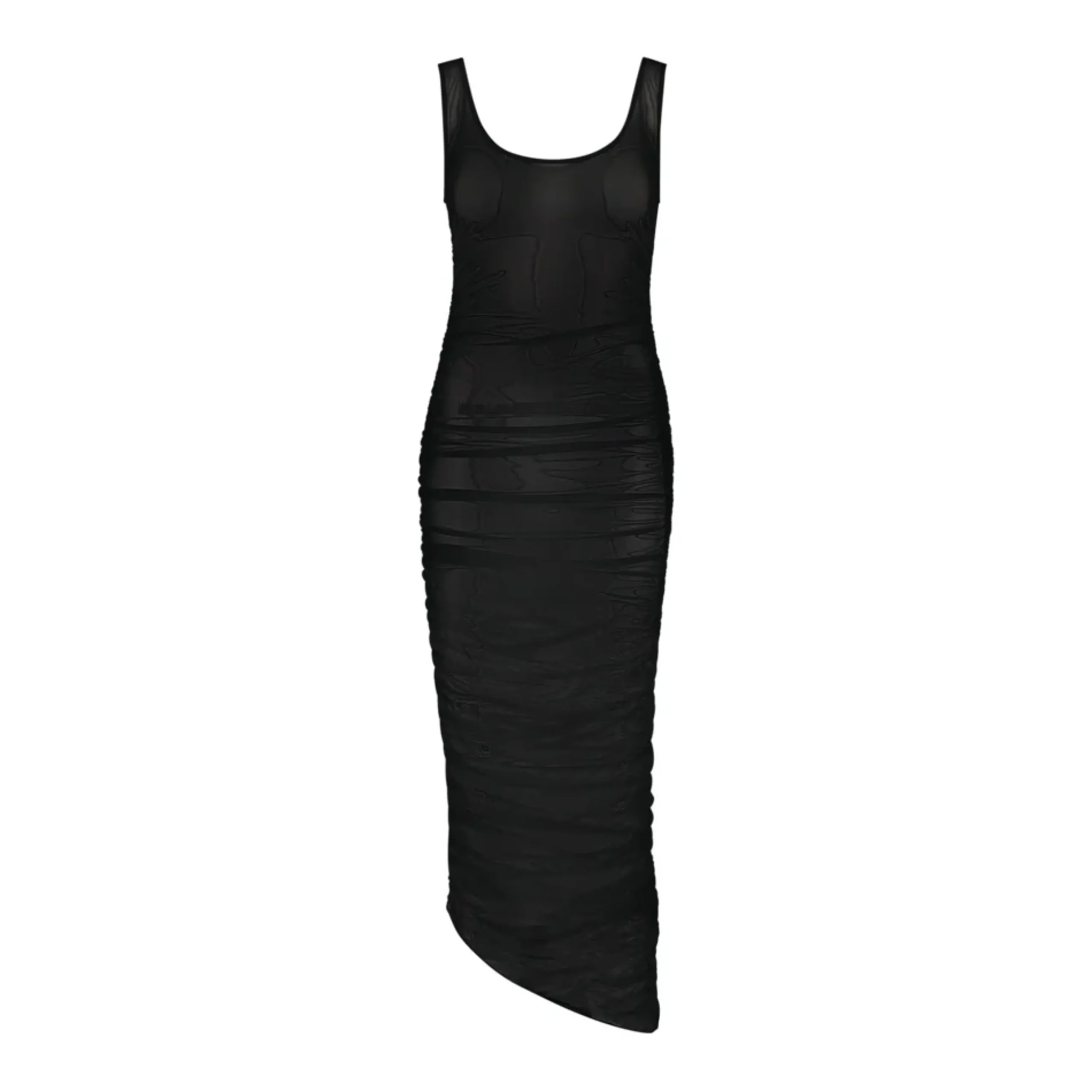 The Stevie dress is made in a silky soft, sheer, fine mesh fabric. Its asymmetrical hemline and gathered body complement your gorgeous figure. A sleeveless, midi-length dress with delicate baby merrow hemming, scoop neck and low cut back, it’s beautiful!